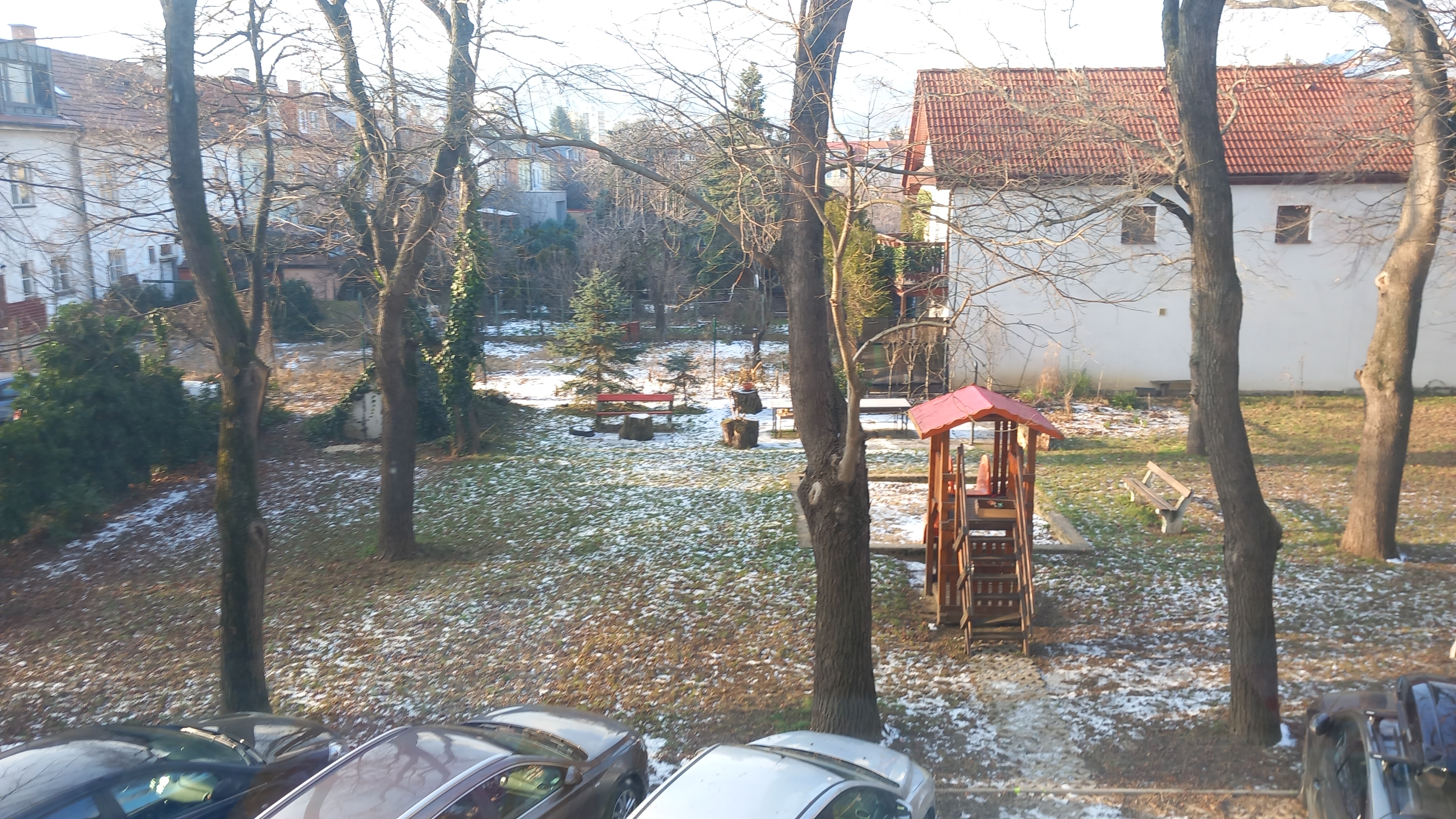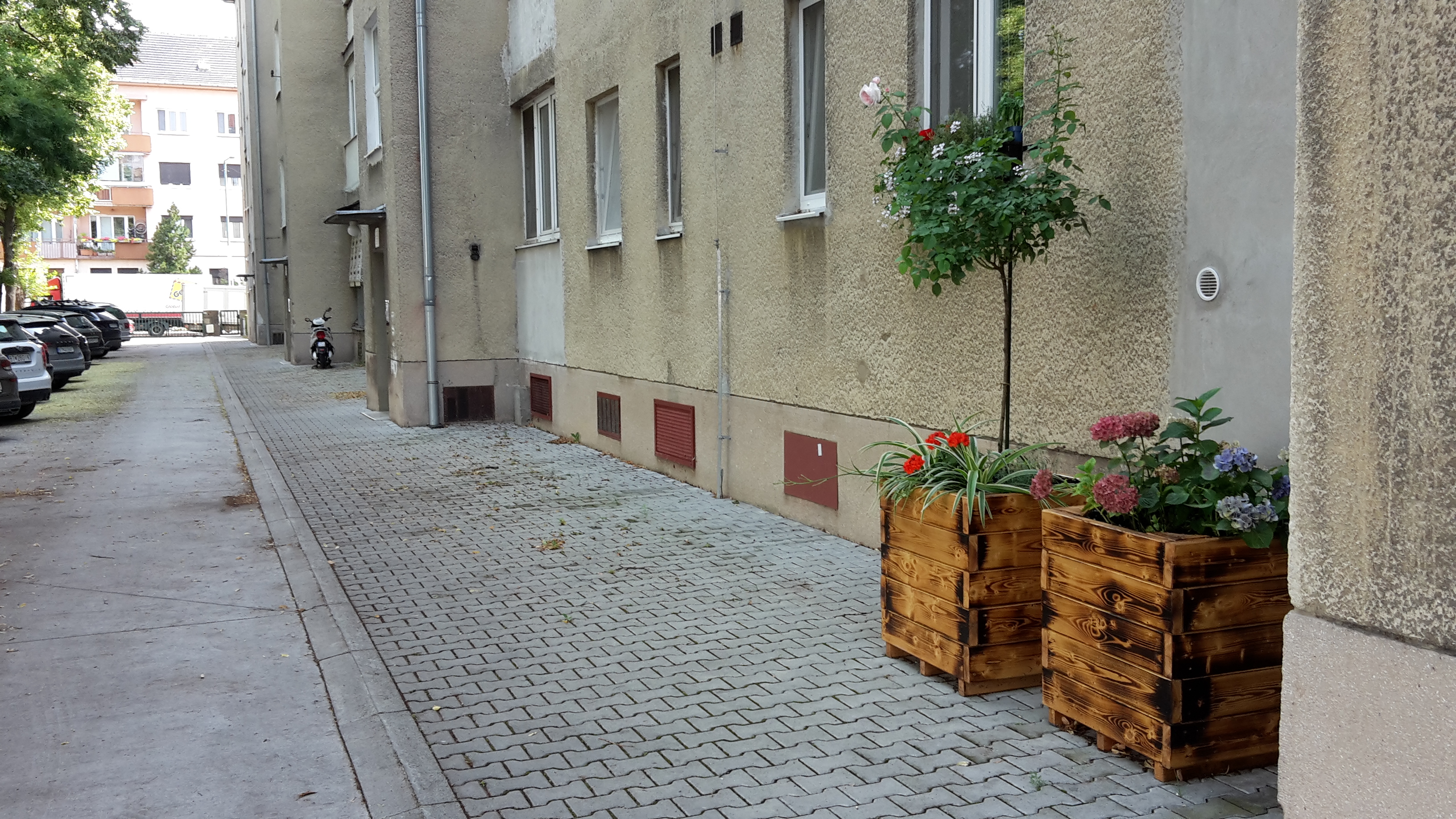 Kuchyňa s pol izbou a loggiou sú orientované do tichého vlastného uzavretého dvora s rozlohou 18 árov, kde majú možnosť parkovať vlastníci bytov  v bytovom dome a taktiež oddychová zóna s lavičkami a detským ihriskom. Zčasti murovaná pivnica sa nachádza v suteréne bytového domu.